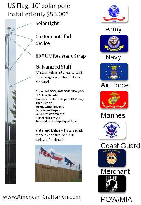 American Craftsmen proudly manufactures custom flag poles for home and business displays. Please call Steve @ 972-442-3352 for complete details. Complete pricing coming soon!